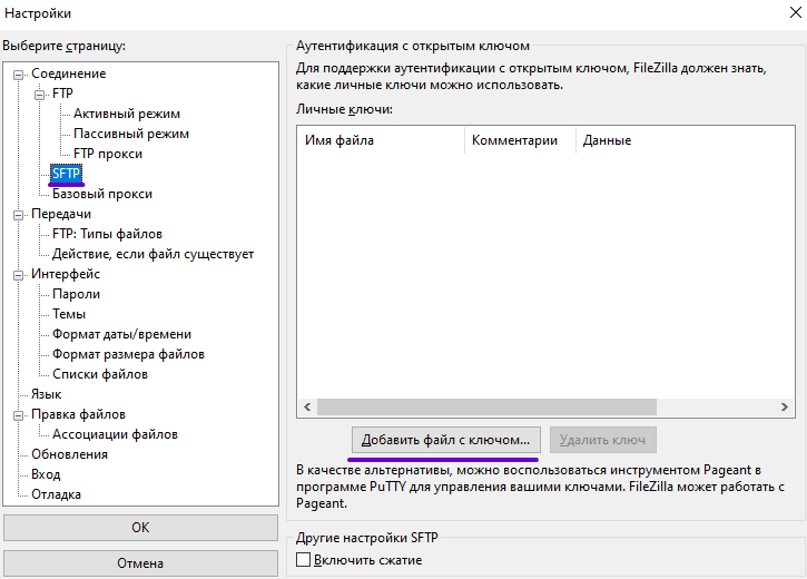 Then open the sFTP page and click the Add key file button.