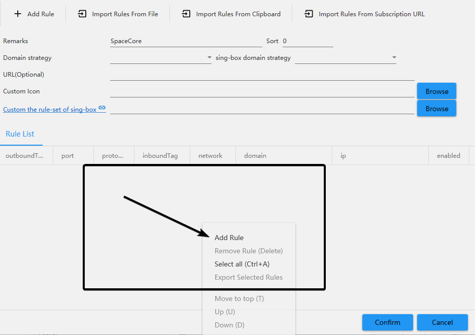 Right-click in the area marked by the black square. A menu will open — select "Add Rule".