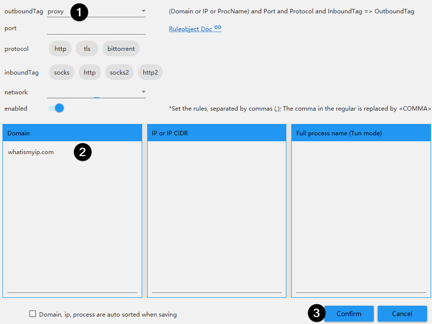 For example, to make Discord work through the VPN, you need to specify these domains. For YouTube, use this list. As an example, we will specify the whatismyip.com service to verify that our IP address is actually changing. Click "Confirm" to save the rule.