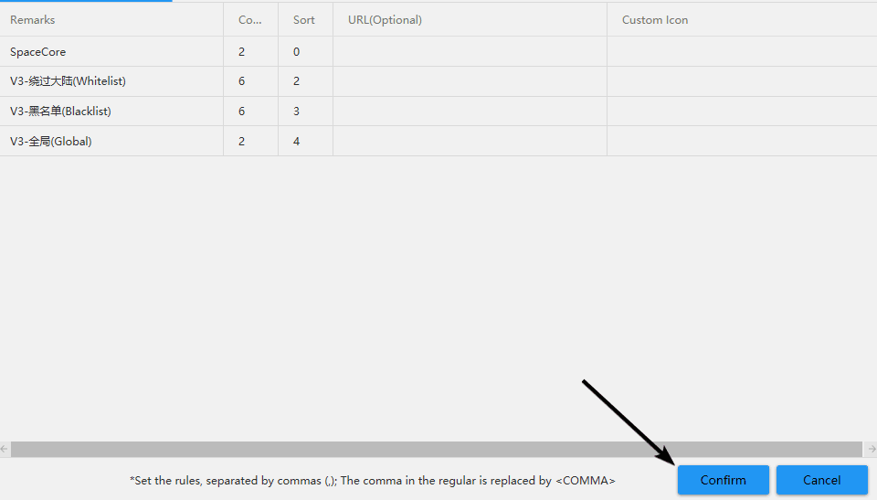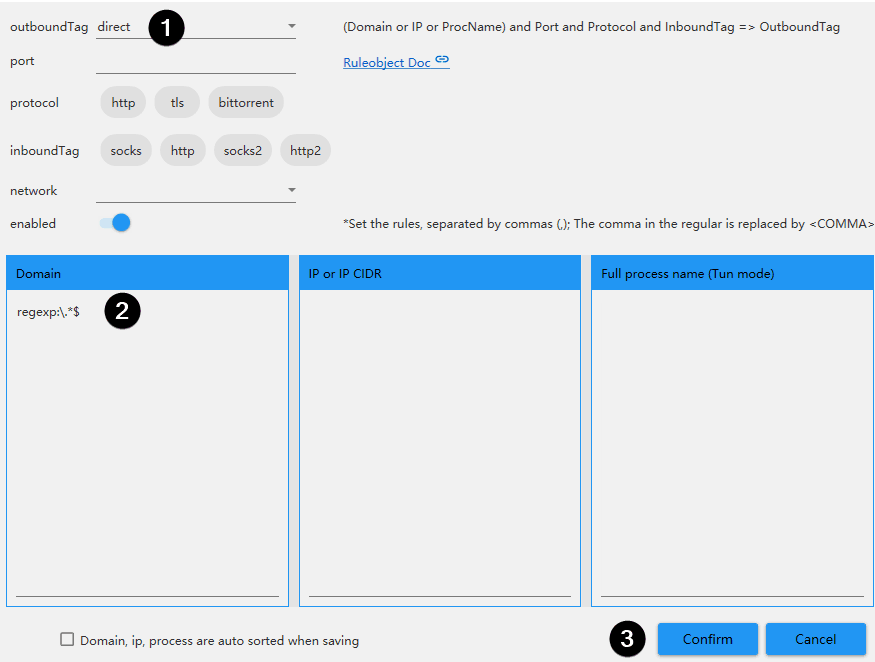 Next, create another rule in the same way. This time, select the "Direct" proxy type. In the domains block, enter the following expression regexp:\.*$
