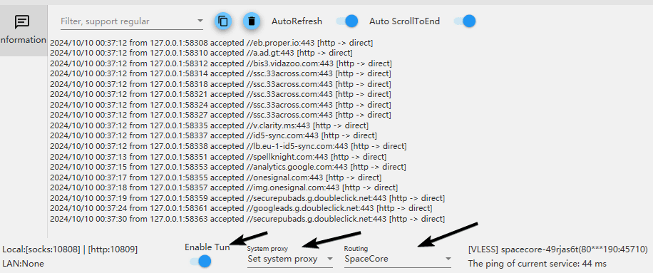 For the "Routing" parameter, select the profile you created using the steps above. Set the "System proxy" parameter to "Set system proxy", then click "Enable Tun" to start the tunnel.