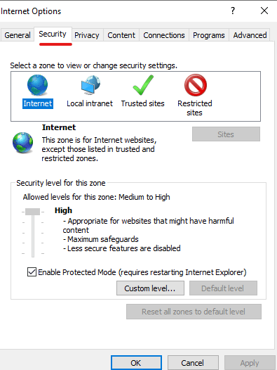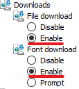 Clear the Enable Protected Mode checkbox and click Custom level. In the window that opens, scroll down and locate the following settings: