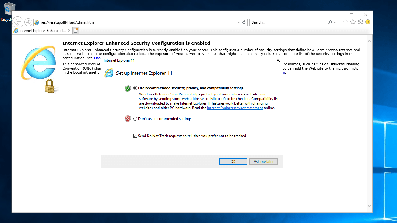 Connect to the remote server. Open Internet Explorer, select the recommended settings, and click OK.