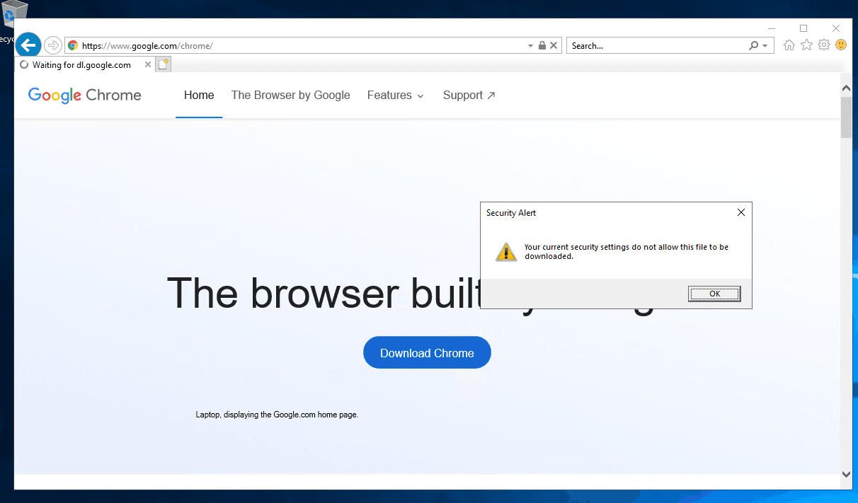 If you try to download a file, you will see a message stating that the current security settings do not allow this action. Click OK.