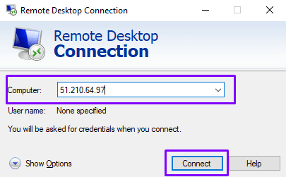 The Windows Remote Desktop client then opens. In the "Computer" field, enter the server IP address you want to connect to.