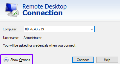 The user name Administrator is filled in by default. Next, open the advanced settings by clicking the "Show Options" button.