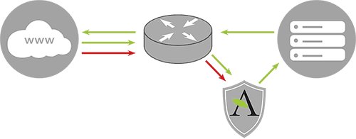 (In the diagram: green arrows between the internet, router, and servers represent clean traffic.)
