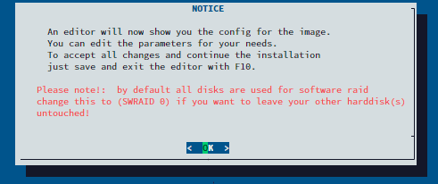 The installimage utility is a special tool for semi-automatic installation of the operating system. During this process you can configure the main settings, such as the RAID level, network configuration, partition layout and so on.