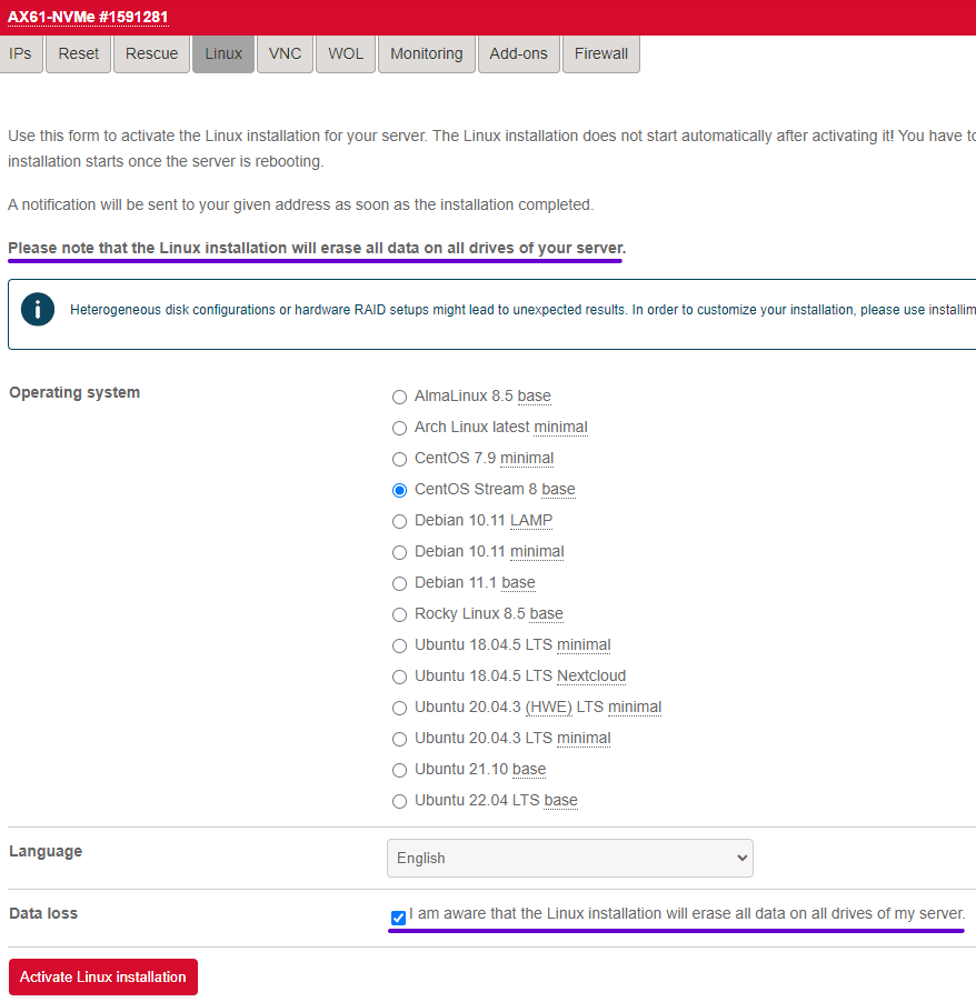 First, go to this section and review the information. Then choose a suitable OS from the available images. After that, check the box confirming that all data on the dedicated server’s drives will be erased.