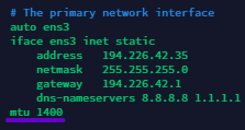 Then, at the end of the corresponding network interface configuration, add mtu 1400
