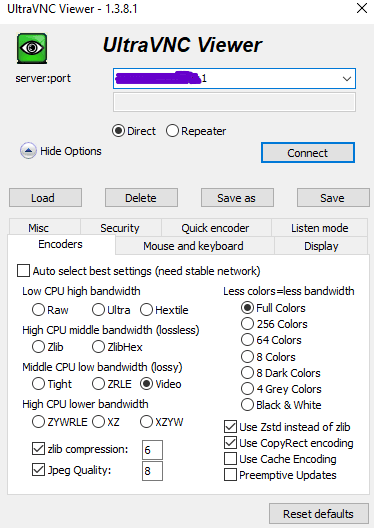 Next, install and run UltraVNC. In the input field, enter the address of your server plus port "1" in the format "IP:1".