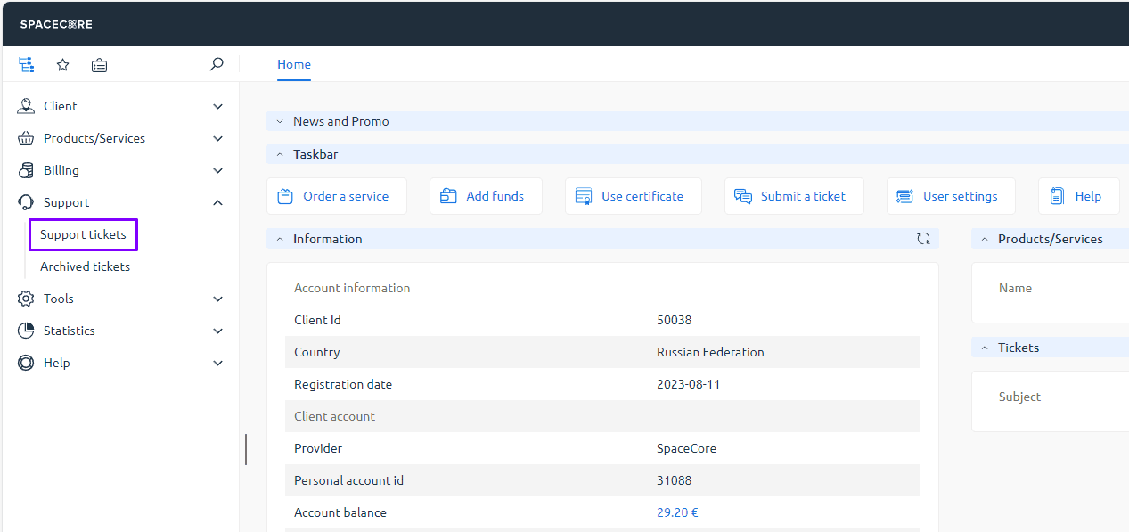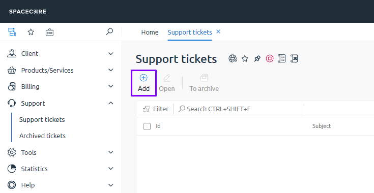 In the menu on the left expand the “Support” section and select the “Tickets” page.