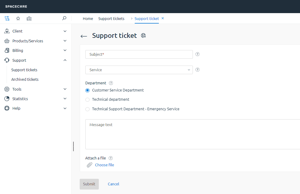 In the form specify the subject service department and give a detailed description of the issue — after that you can submit the request to support.
