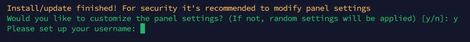 Enter y to confirm that you want to change the panel settings before installation (for additional security). Then you need to specify a username (login) that will be used for authentication.