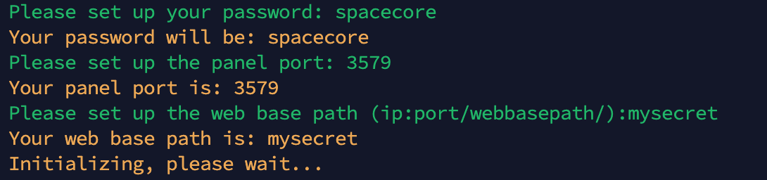 In the same way, specify the user password, the panel port (we recommend using a non-standard port), as well as the web path to the panel site (the panel URL will have the format ip:port/web-path).