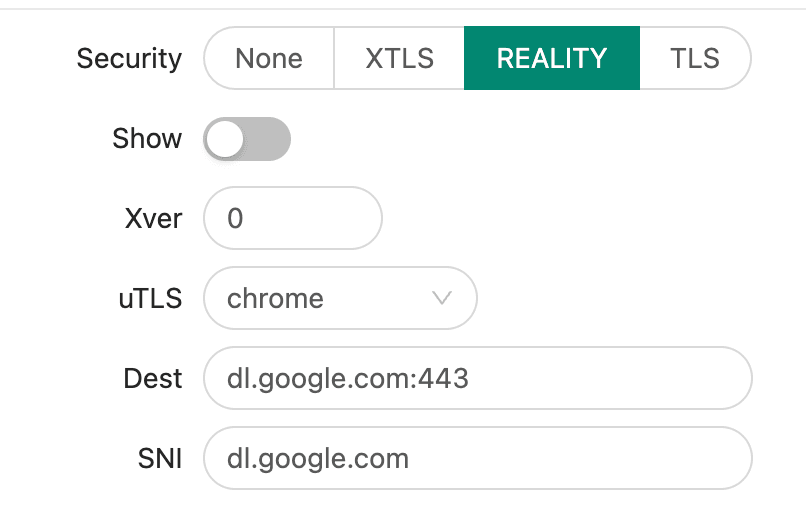 Below, select Security type "Reality". Set uTLS to "chrome". By default, yahoo.com is used as the camouflage (masking) domain, but we recommend specifying other values, for example, dl.google.com:443 in the "Dest" field and dl.google.com in "SNI".