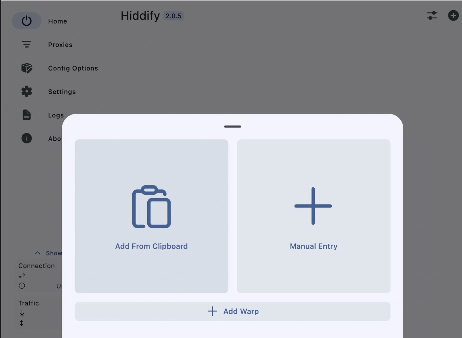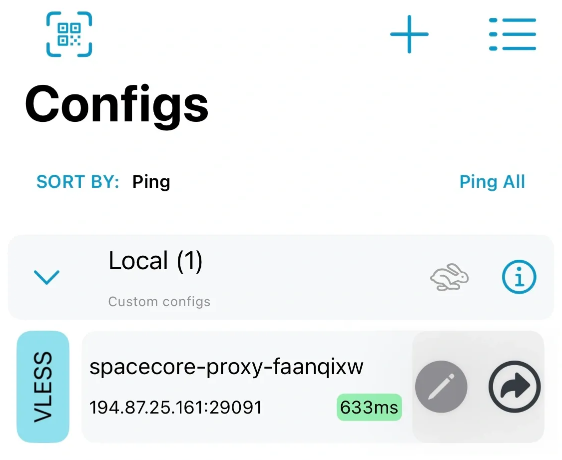 Configuration is just as simple. Go to the Configs section and scan the QR code. After that, the configuration will be added to the application.
