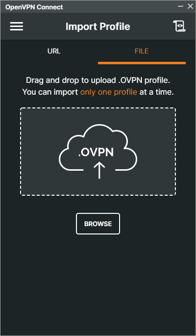 After installation, you can add a client either via a link or by using a file. In this example, we will use the second option. Simply drag and drop or manually select the "spacecore.ovpn" file that you downloaded from your server.