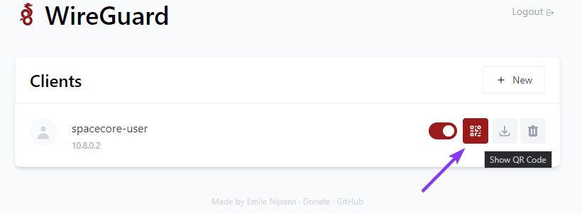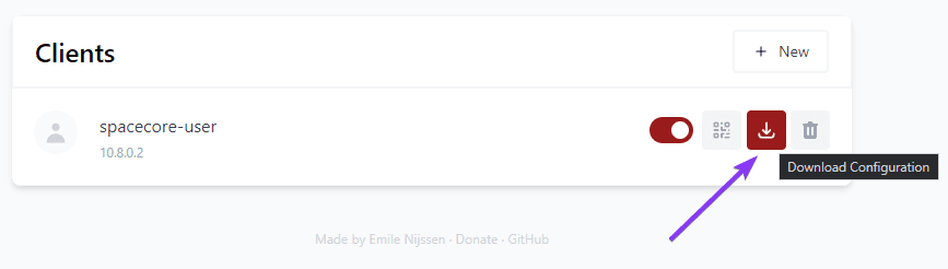To download the configuration file, use the corresponding button next to the created user.