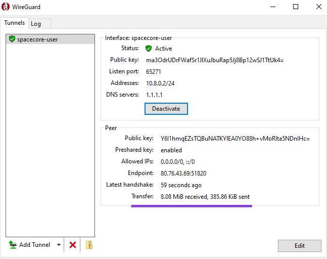 If everything is done correctly, after adding and activating the tunnel you will see active incoming and outgoing traffic.