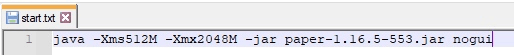 java -Xms512M -Xmx2048M -jar paper-1.16.5-553.jar nogui