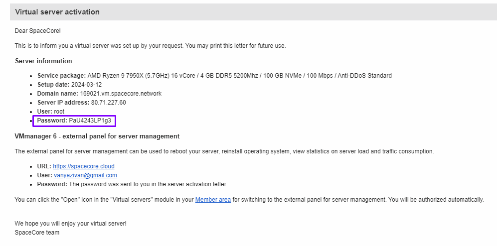After the service is activated, you will receive an email with all server details, for example: