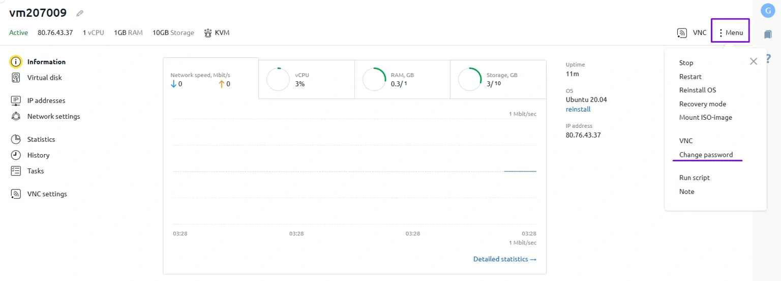 Next, click on the required service. This will take you to the server settings page. Then click the Menu button with three dots next to it and select Change password in the popup window.