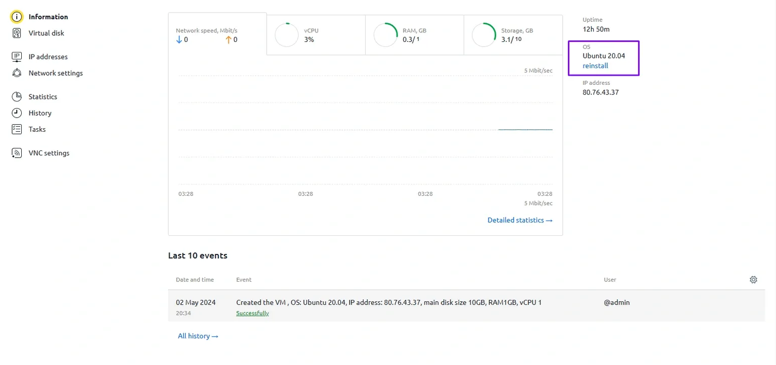 Please note: reinstallation of Linux distributions usually takes about 2–3 minutes, while installing Windows images can take up to 20 minutes.