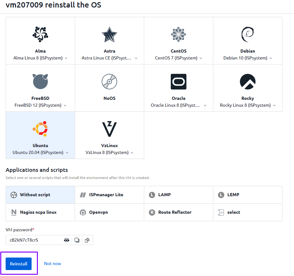 We recommend either saving the password in a safe place or enabling password delivery by email, because after clicking "Reinstall" the chosen password will not be displayed anywhere in the control panel.