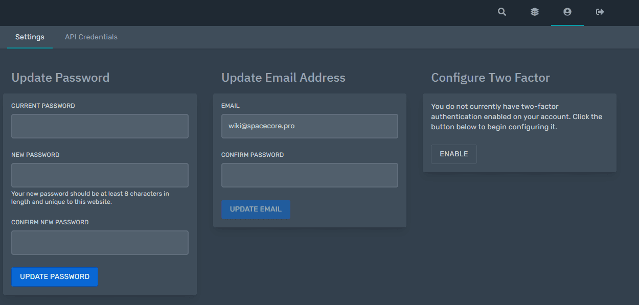 The third tab allows you to manage your profile settings, namely change your password, email address and enable 2FA authentication. You can also configure the API there.
