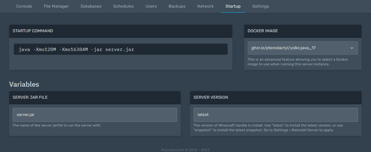 Please note that the available parameters will vary depending on the game selected for your server. An example for Minecraft Vanilla is shown in the screenshot below.