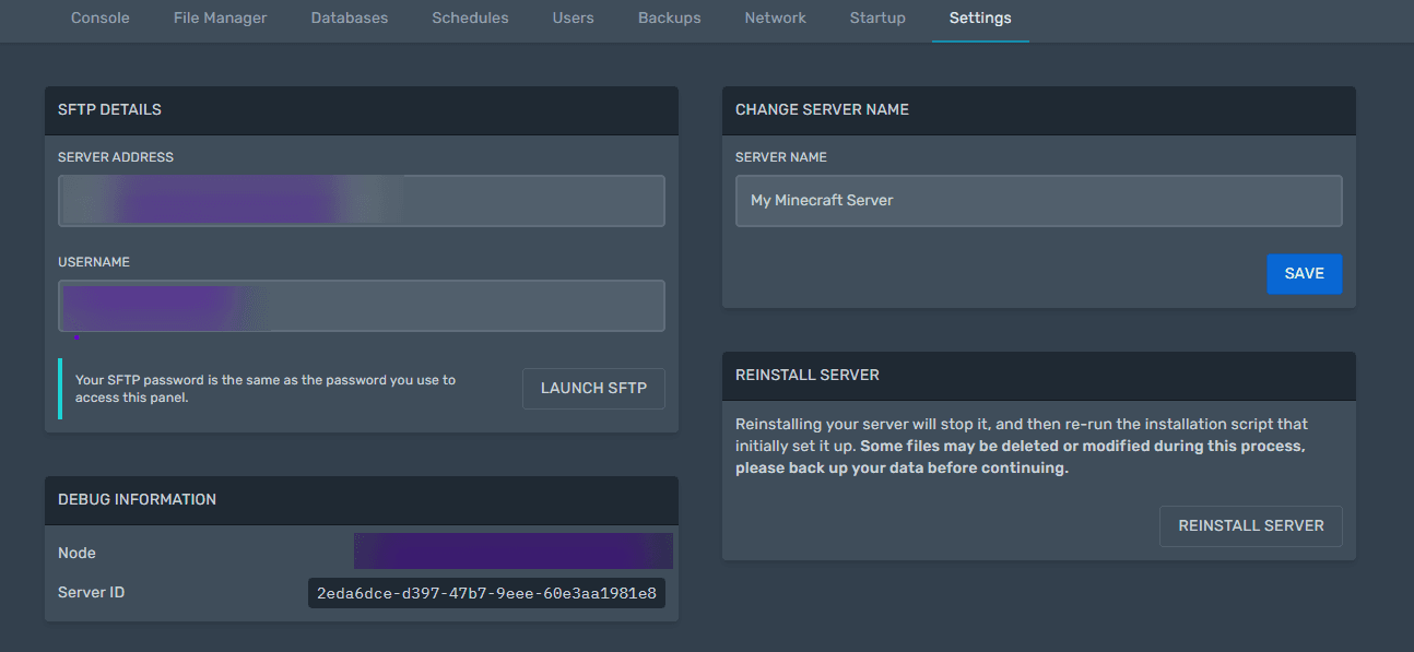 In the Settings section you will find the credentials for sFTP access to your game server. You can also change the display name of your server in the game panel. In the bottom-right corner there is a button to fully reinstall the selected game server.