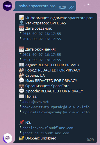 Выводит информацию об указанном доменном имени, куда входят регистрационные данные и NS-записи.