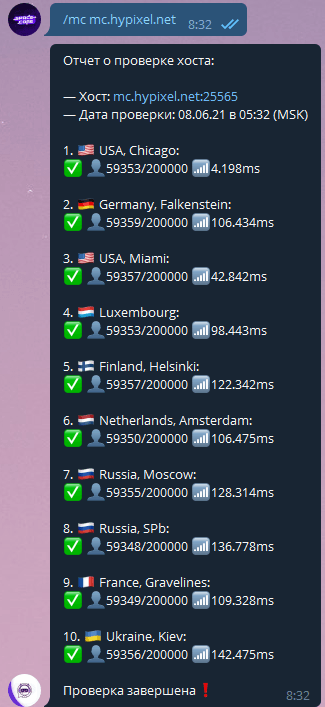 Команда осуществляет пинг сервера Minecraft со всех локаций, а также выводит текущий онлайн.