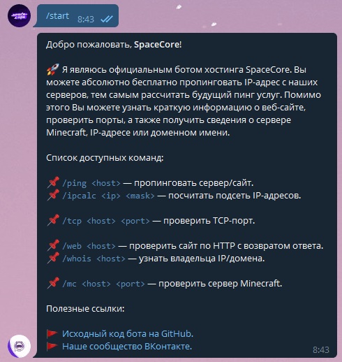 При использовании команды /start мы видим приветственное сообщение бота со всеми доступными командами и прочей информацией. Давайте рассмотрим всё подробнее:
