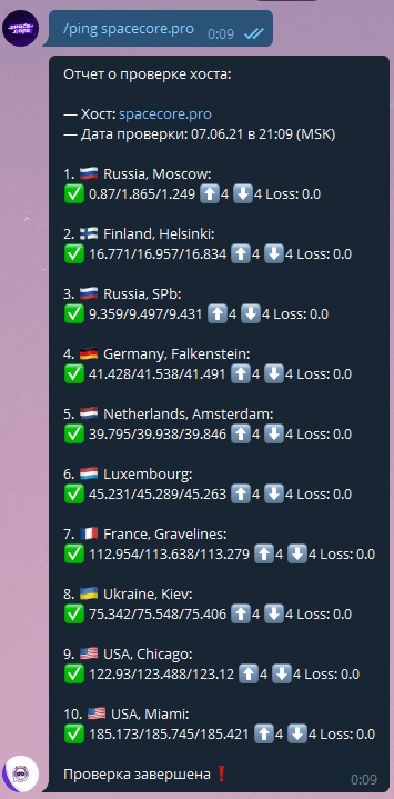 Дополнительно отображается имя проверяемого хоста и дата проверки. Таким образом вы очень легко можете рассчитать пинг от одной локации до другой, поскольку некоторые серверы являются узлами наших услуг.