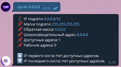 Показывает информацию про указанный IP-адрес, а также применённую маску подсети. Вам необходимо указать адрес и маску подсети, разделив их знаком «/». Помимо этого вы можете указать только IP-адрес, тогда будет автоматически использована маска /32.