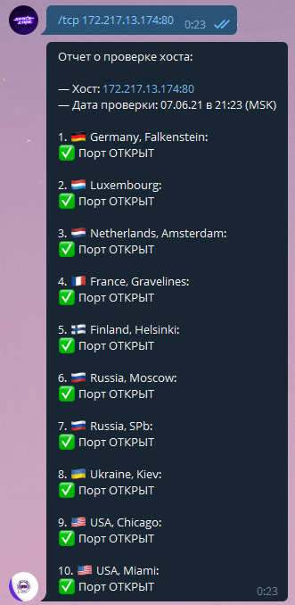 Команда позволяет проверить доступность TCP-портов у IP-адреса с различных локаций. Используется как IP port или IP:port.