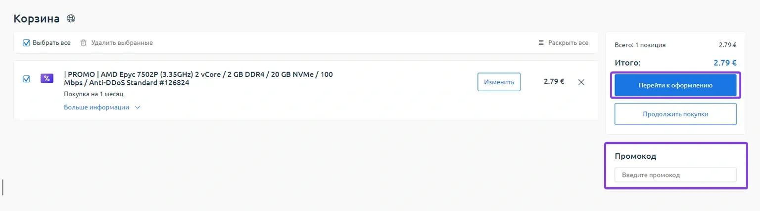 • при наличии промокода — ввести его в соответствующее поле для применения скидки.