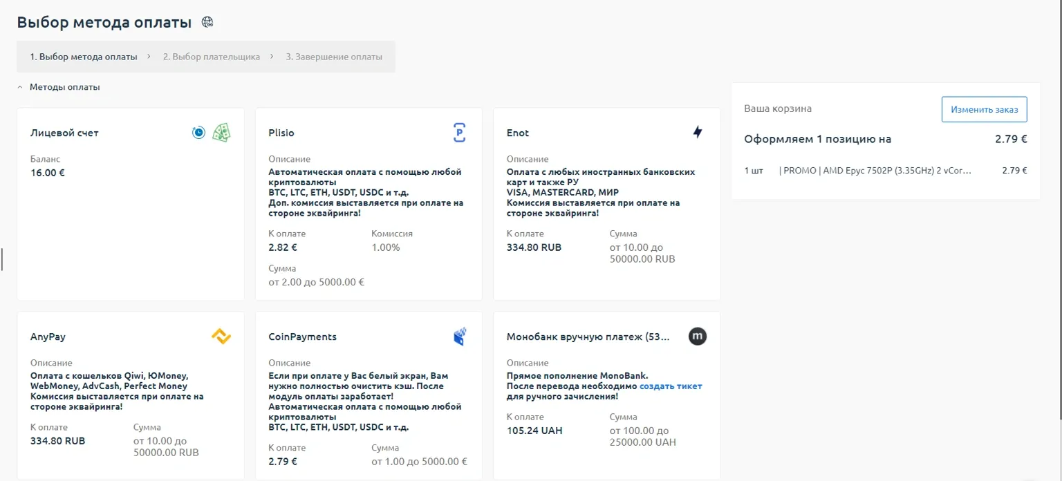 На этапе оплаты выберите удобный способ оплаты из списка доступных платежных методов. Если на вашем лицевом счете достаточно средств, можно оплатить заказ напрямую с баланса.