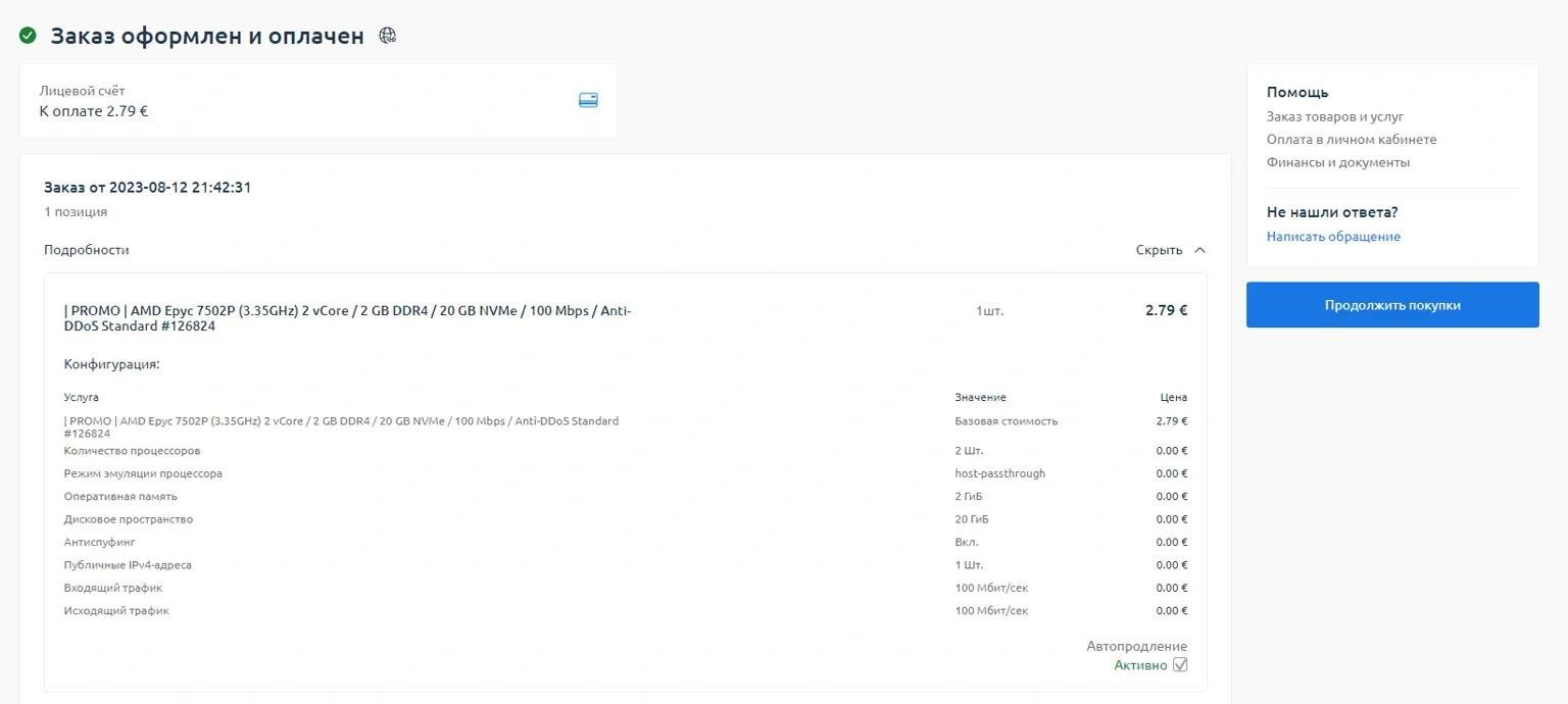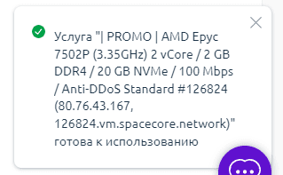 После успешной оплаты на странице отобразится уведомление, а заказанный виртуальный сервер будет автоматически поставлен в очередь на активацию. Данные для доступа появятся в разделе с виртуальными серверами в личном кабинете.