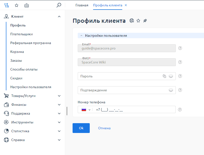 Важно: смена пароля в данном разделе изменяет пароль только для личного кабинета. В других сервисах SpaceCore пароль останется прежним.