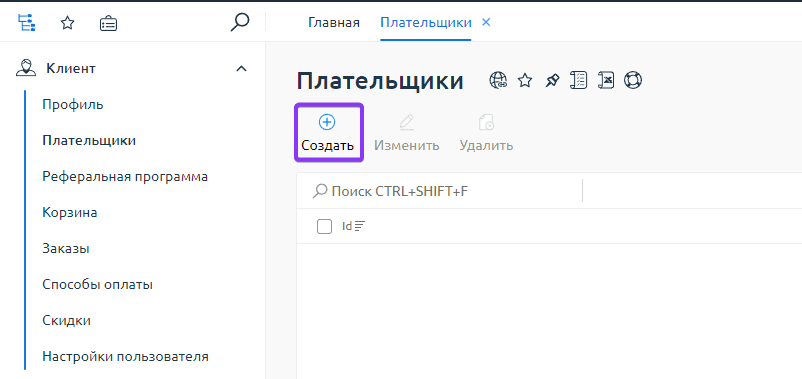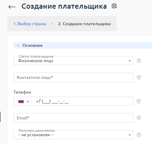 Чтобы добавить плательщика, нажмите кнопку «Создать» и укажите контактные данные нового пользователя.