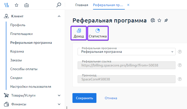 - «Доход» — показывает доход с каждого заказа реферальных клиентов.
