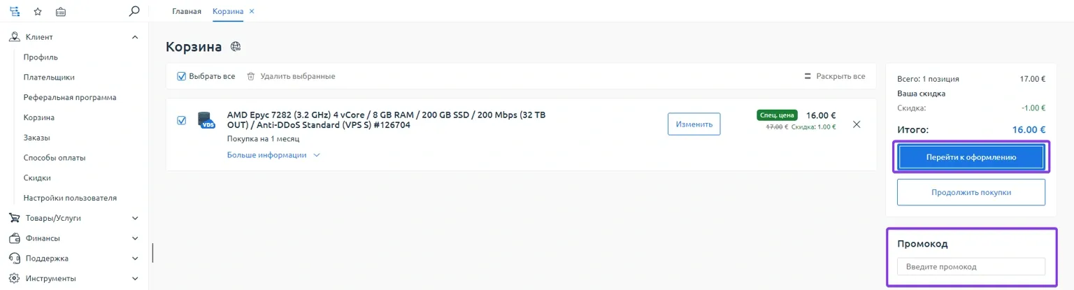 В разделе «Корзина» отображаются все выбранные Вами серверы и услуги, которые ожидают оплаты.