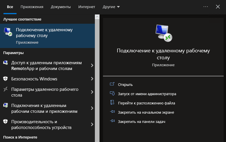 Нам потребуется любая утилита для подключения по RDP. Во все последние версии ОС Windows встроено специальное ПО для этих целей, им мы и воспользуемся. В поиске системы найдите и откройте следующее приложение: