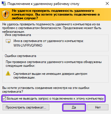 Появляется окно, в котором следует подтвердить подлинность сертификата сервера, к которому производится подключение. Устанавливаем галочку, чтобы подобные запросы не появлялись при следующих подключениях к этому серверу, и нажимаем «Да».