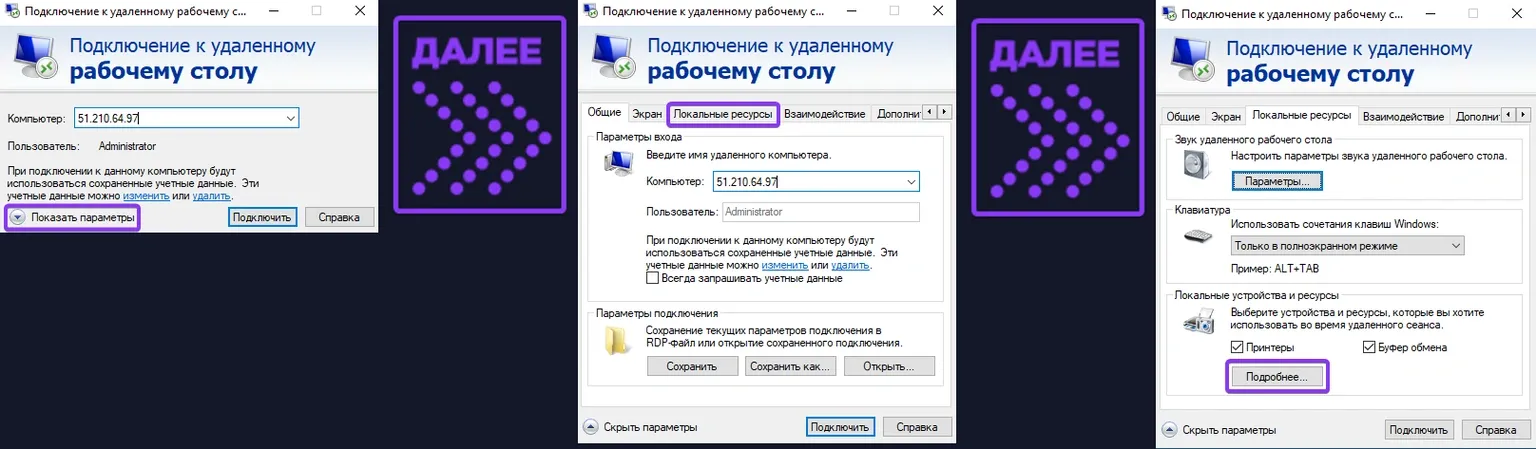 Используемая нами утилита имеет встроенную функцию передачи данных на удаленный сервер. Открываем все то же приложение. Далее разверните параметры и перейдите в раздел «Локальные ресурсы». В категории «Локальные устройства и ресурсы» нажмите на кнопку «Подробнее».