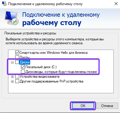 В открывшемся окне разверните список «Диски» и выберите накопители своего компьютера, которые будут подключены к удаленному серверу, и сохраните изменения кнопкой «ОК».