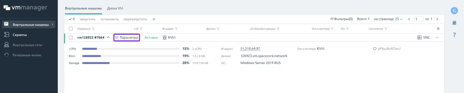 На странице панели управления раскройте вкладку Вашего сервера и перейдите по кнопке «Параметры».